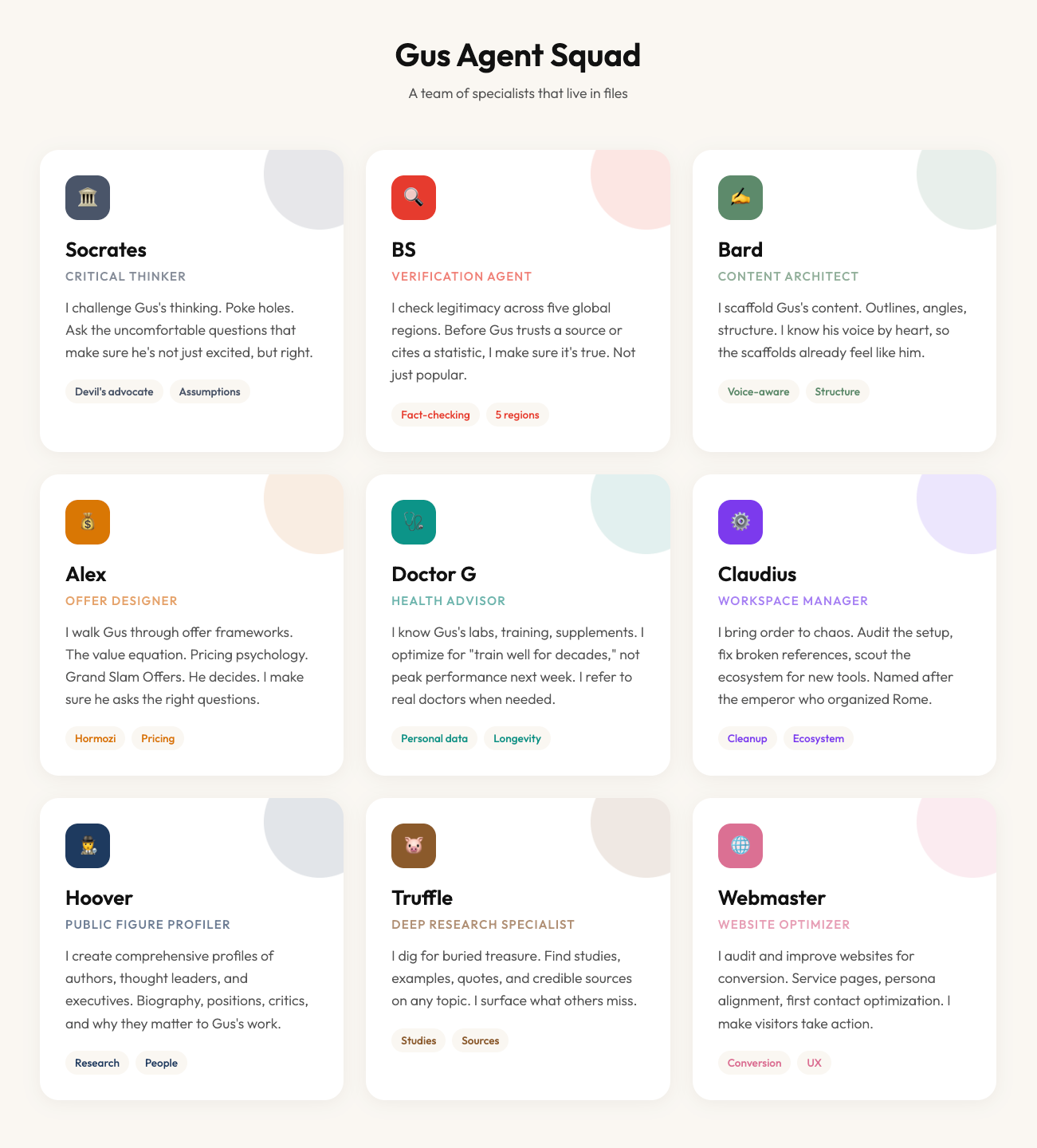 Remember those agents I mentioned earlier? Once I had my context and voice encoded, the next step was building them. Each is a specialized thinking partner that knows how to approach specific jobs like I would.